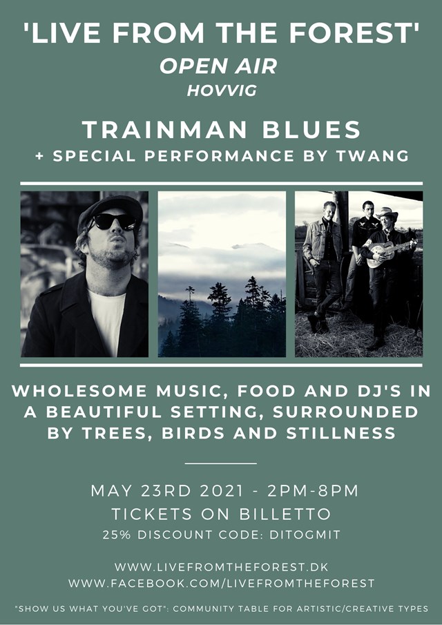 Søndag d. 23. maj 2021 kl. 14.00 byder to nytilflyttede ildsjæle til en særlig eftermiddag på Odsherreds nye live musik sted midt i skoven; ’Live from The Forest’. Der bydes på både live musik fra anerkendte artister, lækker mad og fællesskab, særligt for lokale kunstnere. Det international anerkendte blues band Trainman Blues spiller årets første live koncert under åben himmel og trioen Twang skaber en nærværende og intim performance dybt inde i skoven.