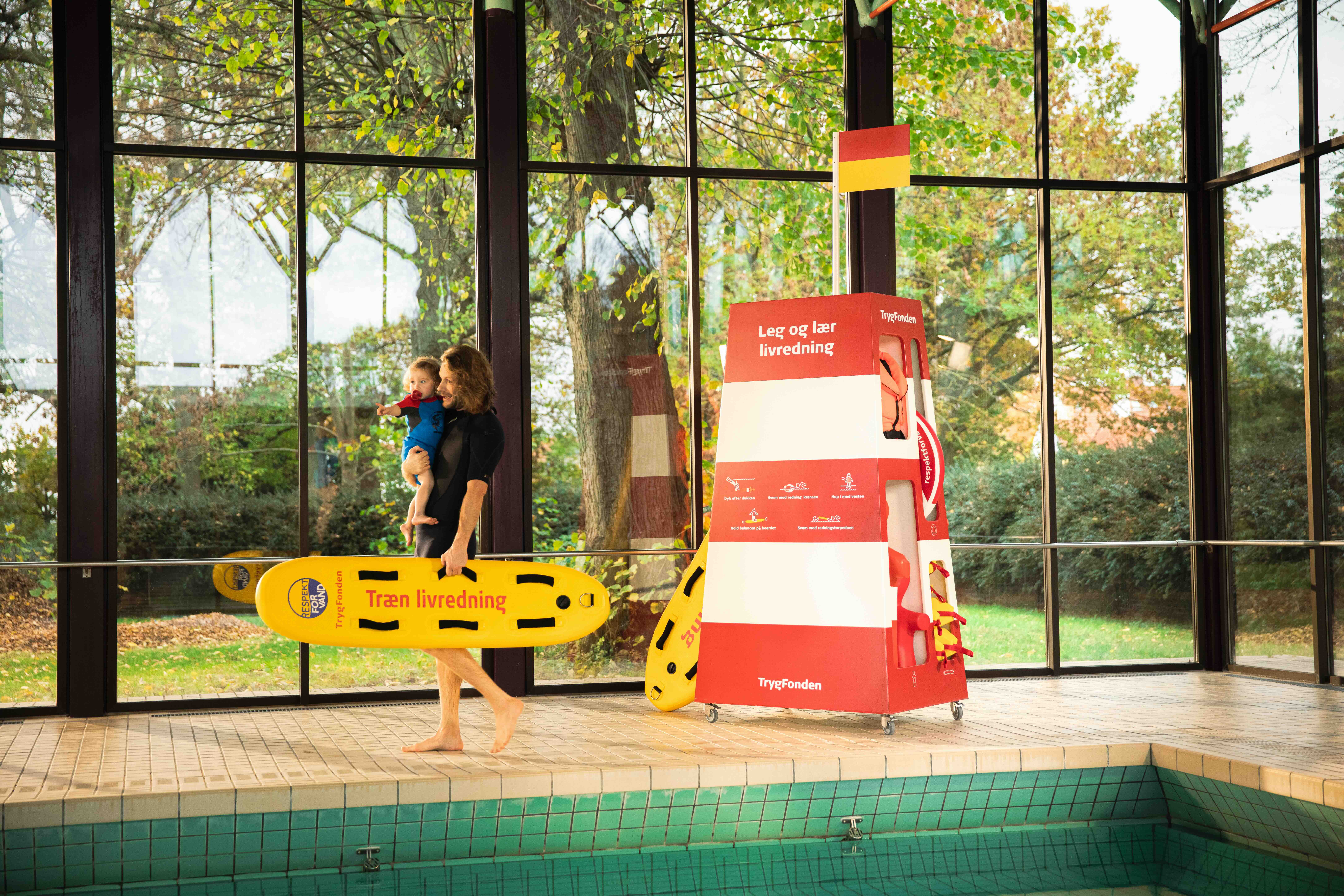 På Respektforvand.dk kan man se, hvor TrygFondens livreddere er til stede, og hvilke svømmehaller der har et såkaldt Leg- og Lær-livreddertårn med ægte livredderudstyr til fri afbenyttelse. Prøv fx at svømme med en redningstorpedo, balancere på et rescue board eller bjærge en dukke. Ved tårnene er der også forslag til øvelser, ligesom man kan finde ideer til gode og sjove øvelser her: https://www.respektforvand.dk/leg-og-laer-livredning/vandtilvaenning-for-boern