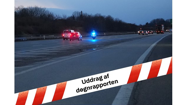 Kl. 09.54 – Holbækmotorvejen, Holbæk: en 54-årig mand fra Jylland snurrede rundt flere gange, da han mistede kontrollen over sin personbil, inden den ramte autoværnet i midterrabatten.